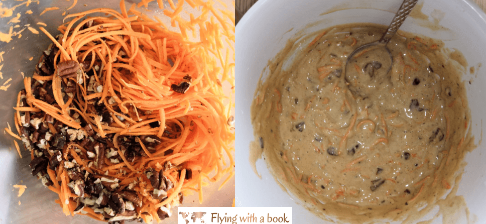 Ajoutez la carotte, l’ananas et les noix de pécan. Beurrez et remplissez le moule, puis enfournez-le pour 20 minutes (à surveiller) !