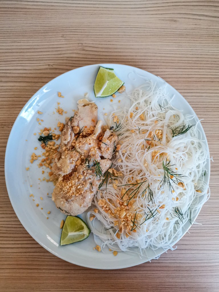 Servez avec des vermicelles, des quartiers de citron vert, quelques feuilles de coriandre, et parsemez de cacahuètes !