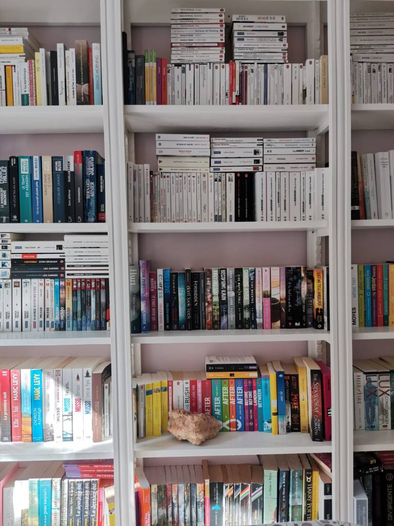 À présent, mes livres se partagent entre ma bibliothèque dans ma chambre d’adolescente, et dans mon appartement étudiant (je n’y ai pas accès actuellement donc je ne peux pas vous mettre de photos). Mes livres ne rentrent plus sur mes étagères, ce pourquoi j’ai dû les ranger les uns sur les autres, ou encore dans un grand carton.