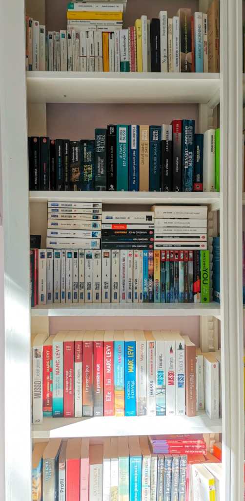 En Troisième, j’ai déménagé (pour la douzième et dernière fois) et dans la maison se trouvait une grande bibliothèque en bois. Ma mère me l’a nettoyée et repeinte en blanc, et c’est ma bibliothèque jusqu’à aujourd’hui, depuis presque dix ans. Son contenu a évolué au fil des années, mais certains livres sont intemporels et y auront toujours leur place. J’ai à disposition 5 rangées et 3 colonnes de livres, 15 cases qui ne sont jamais suffisantes…