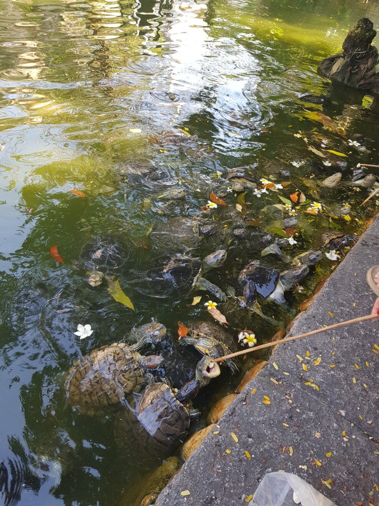 Ce temple a littéralement été ma passion pendant l’espace de quelques heures ! J’y suis retournée deux fois. Il ne s’agit pas d’un temple à proprement parler mais d’un point d’eau où vous trouverez des dizaines de tortues. Des Thaïs viennent s’y poser un moment, souvent avec leurs enfants. Cela reste un endroit calme, et à plusieurs reprises, des Thaïs m’avaient partagé son sachet de nourriture à tortues (des fruits et des boulettes de porc). Nous avons passé un long moment à nourrir les tortues !
